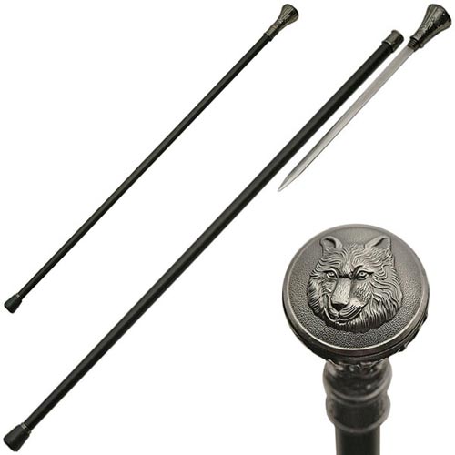 Wolf Head Sword Canes are 36 inches in all. Unscrew the top of the handle to reveal the 12 ΒΌ inch unsharpened stainless steel blade. The cane shaft is crafted in black aluminum and has a rubber stabilizing foot on the end. The top of the handle features a fierce wolf head. Buy the Wolf Sword Canes for $69.99.