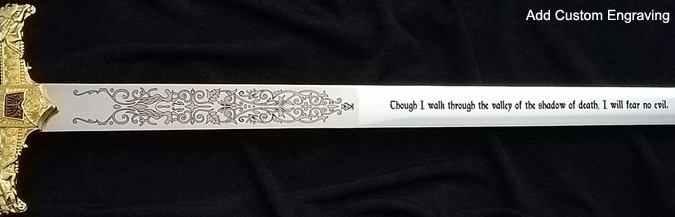 Custom engrave this piece with up to 60 characters of text. Swords can be individualized with names, phrases or credentials. This custom engraving service is ideal for ceremonies, personalized gifts and awards. The engraving will be placed above the guard on the right side of the sword blade and will read from left to right or from the hand guard to the blade point of the sword. Add the engraving service for only $25.00 per sword.