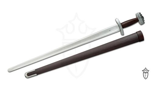 Kingston Arms Battle Ready Tourney Swords are 36 ½ inches in all. These Viking Swords are from Tourney Series of sparring and stage combat swords that feature blunt blades with rounded edges and thru-tang construction. The 30 inch blade is forged from 9260-Spring steel that has been tempered to approximately 50 HRC. The 2 mm rounded blade edges make them ideal for reenactment and stage combat. These Viking Swords have a peened stainless steel guard. The pommel is pressed into place and hot peened. The real leather grip is wrapped with cord for a comfortable grip. The 4 3/8th inch handle is intended to be long enough to accommodate gloved or armored hands. The oval cross section and slight barrel shape are designed to lessen fatigue. The blade fuller serves to lighten and counter balance the swords. The wooden scabbard is covered in real leather and features a steel tip and chape. The guard is constructed via a special King-Peen system; a steel tab under the grip is pinned through the tang of the sword to keep the guard from loosening. Buy the Tourney Series Viking Swords from the Kingston Arms Reenactment and Stage Combat Sword Collection for only $249.99.