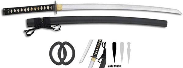 Musashi Elite Katana Swords for sale are 41 inches in all and weigh 2 pounds 11 ounces. These popular cutting swords are from the Performance Elite Series and made to honor Miyamoto Musashi. The functional 29 inch sharp blade is hand forged in T10 high carbon steel. They are designed for multiple cuts in normal targets. The double pegged 11 inch handle features real ray skin and tightly woven leather. The iron Tsuba features the famous double ring design associated with Miyamoto Musashi. They include a sword bag and have a point of balance at 5 inches. Buy the Musashi Elite Katana Swords for $899.99.